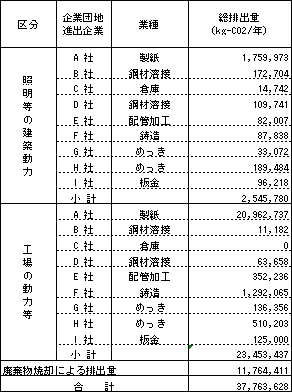 当該工業団地に進出予定の工場別の環境負荷発生量を表4-2-3に示す。製紙業A工場での排出が圧倒的に大きく、A工場での対策の効果が工業団地全体から排出される温室効果ガスの削減量に対し大きく寄与する。