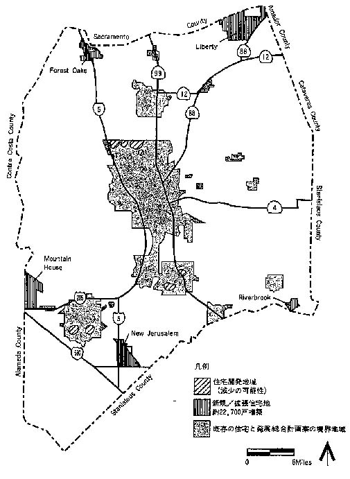 | 住宅及び雇用 | 地域別人口の将来予測と一世帯当たり世帯人員の想定に基づき求められた必要住宅戸数とサンホアキン郡総合計画プログラム2010における新規住宅供給戸数との比較、地域別雇用の将来予測と地域別就業人口の将来予測との比較。 |