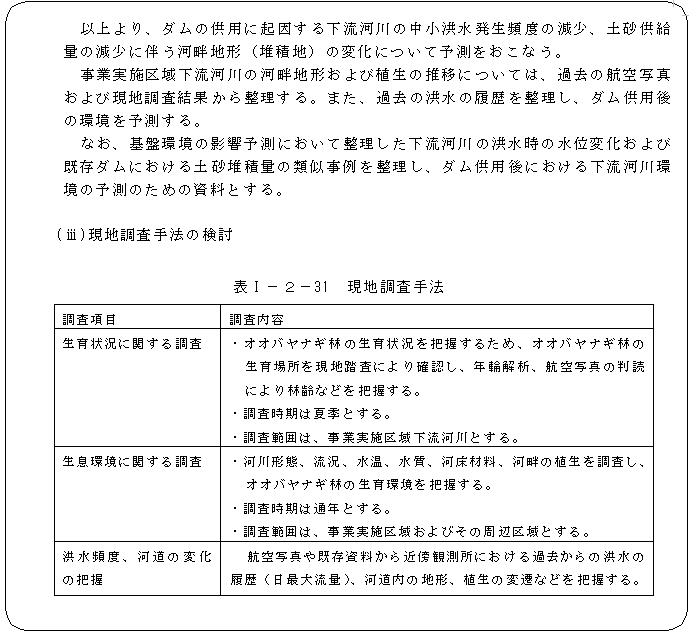 [2]ダム堤体の工事のみならず、護床工および河岸の整備など、河川域内における付帯工事も環境影響を発現する。よって、それらの工法および規模などを整理する必要がある。