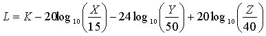 振動源からの距離が増大すれば振動レベルは指数的に減少するが車が大型化すれば振動レベルも増大するという式になっている。 |