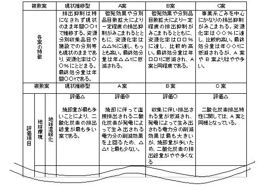 また、計画策定プロセスに環境配慮を組み込むという観点から、SEAにおいて環境面の課題や留意事項を示し、環境面でより望ましい案や折衷案を示していく場合もあると考える。このような評価を行った場合のイメージは、都道府県廃棄物処理計画(表-3.6参照)と同様であるが、より詳細なものとなると考えられる。