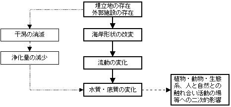 | 注)本ケーススタディでは、干潟等の消滅は想定していないため、埋立地の存在による影響としては、海岸形状の変化による流動の変化を想定している。干潟等の消滅を伴う場合には、干潟の消滅による浄化量の減少が想定される。 |