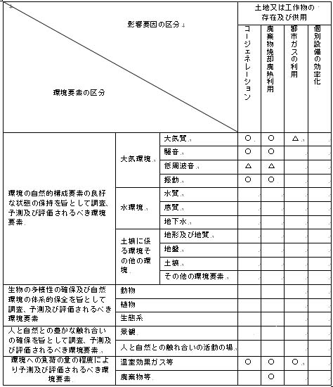 | 環境への負荷の量の程度により予測及び評価されるべき環境要素 | 温室効果ガス等 | ○ | ○ | ○ | ○ | ○ | △ | ||